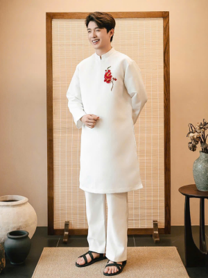 Áo dài nam trắng thêu hoa đỏ – 89K/ngày – M,L,XL