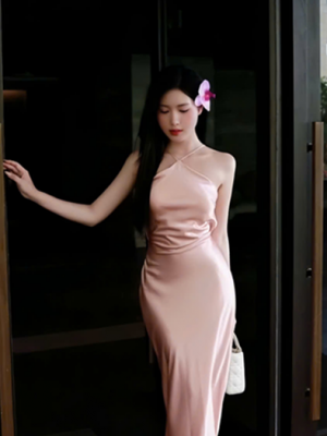 Đầm tiệc lụa hồng cổ yếm – 129k/lần thuê – SM
