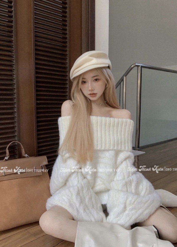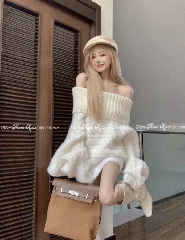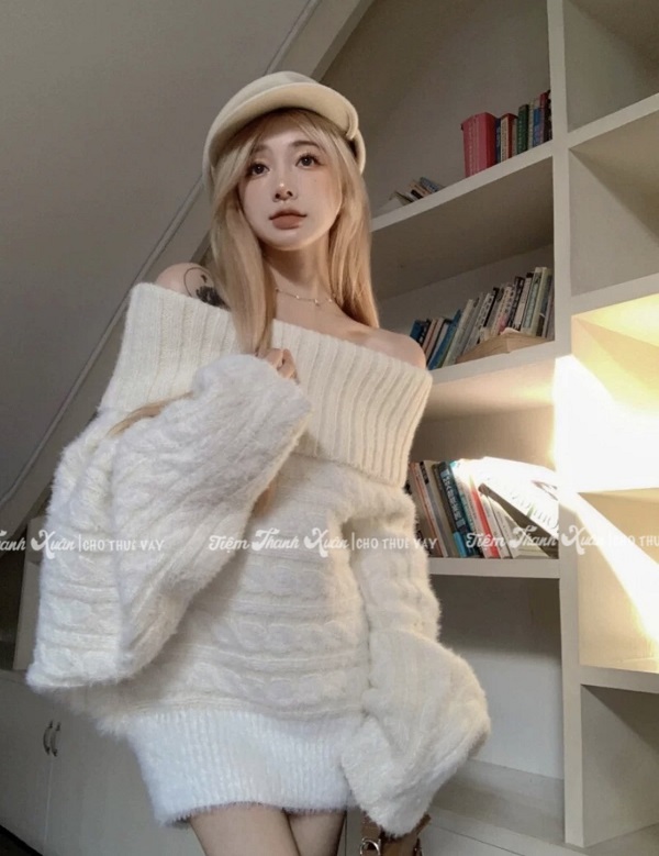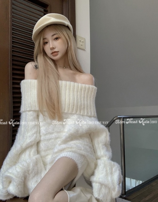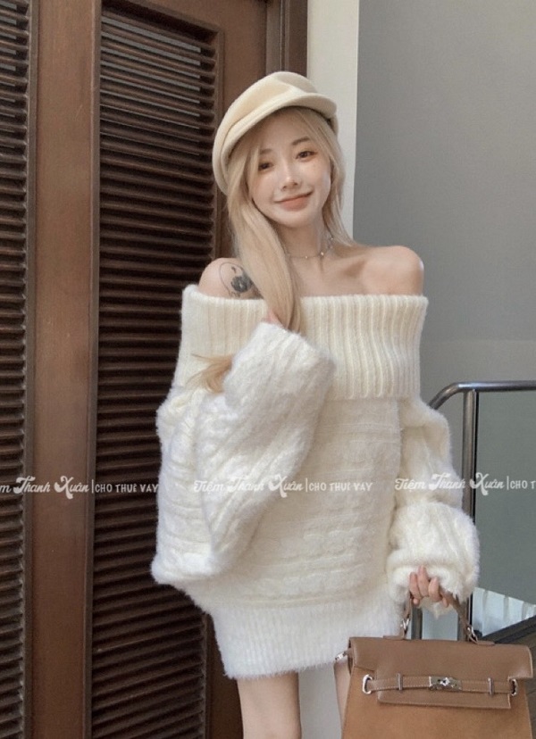 Đầm len trắng bẹt vai – 89k/ngày – freesize